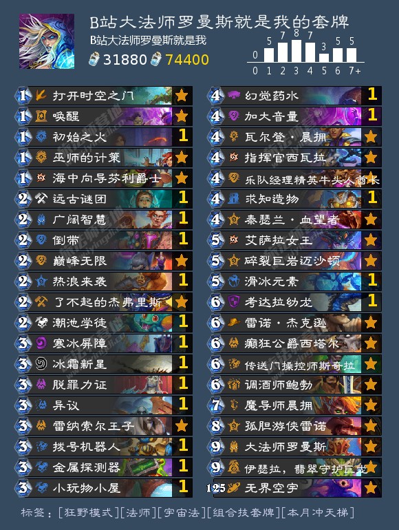 这一套卡组强度可以,但同样的需要尘比较多!请谨慎合卡!一、卡组讲解①优势:很好打一些中后期卡组,往往中期就可以结束比赛。②劣势:怕比较胡的快攻、破坏卡组,如快攻暗牧、圣契骑、号角骑、灌注法等等二、卡组赢点:①任务奖励晨拥补伤害➕开门斩杀②雷诺无限枪弹➕考达拉幼龙点死对面③泰瑟兰(减费)➕大法师安东尼(火球术)打伤害终结④大法师罗曼斯补伤害三、卡组思路前期主要以做任务为主,保证任务和解场同时进行,不要贪手牌防止爆牌中期下奖励晨佣和雷诺➕幼龙等技能或者晨拥叠伤害➕幼龙后期等罗曼斯和牛里的大法师给火球术斩杀祝大家一路连胜!早日上传说!