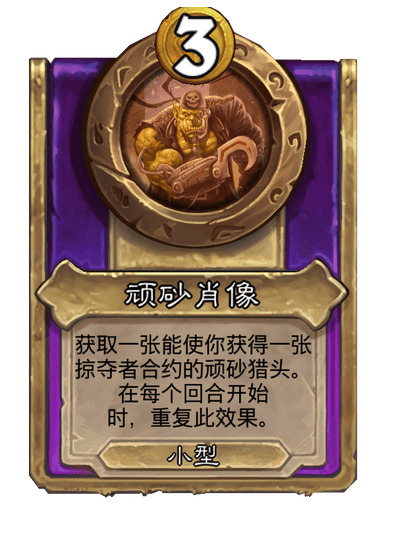 - [小型3费] 获取一张能使你获得一张掠夺者合约的顽砂猎头。在每个回合开始时,重复此效果。