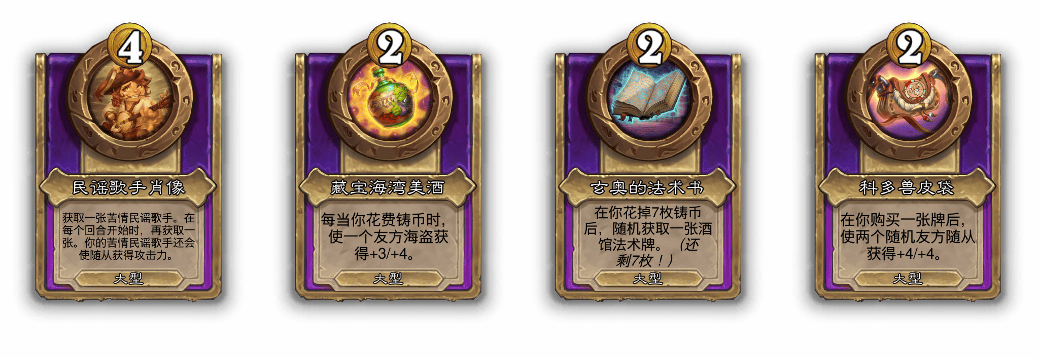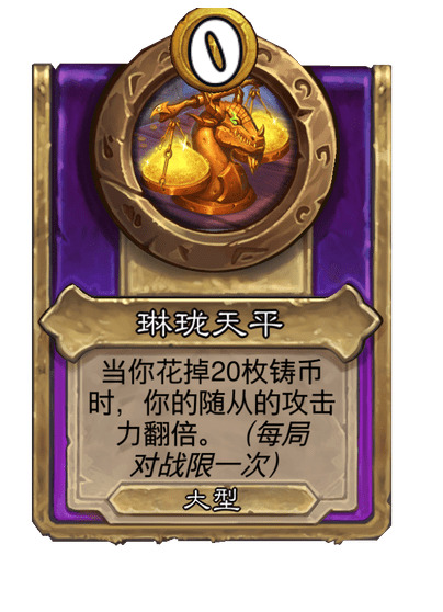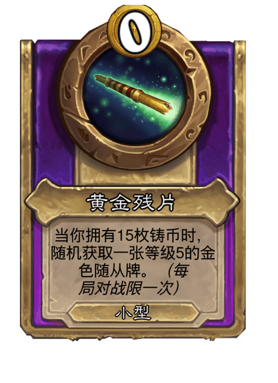 - [小型0费] 当你拥有15枚铸币时,随机获取一张等级5的金色随从牌。(每局对战限一次)