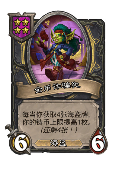 - [小型6费] 获取一张金币诈骗犯。每回合你购买的第一个海盗免费。