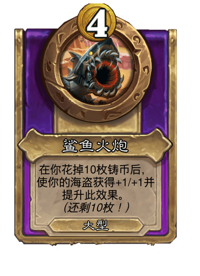 - [大型4费] 在你花掉10枚铸币后,使你的海盗获得+1/+1并提升此效果。