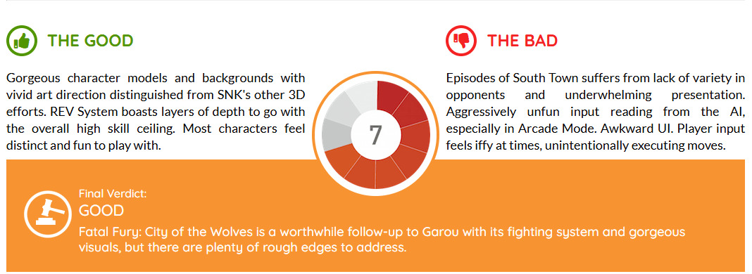 尽管存在一些粗糙之处,加上虽不糟糕却也谈不上精彩的故事模式,《饿狼传说:群狼之城》仍值得一试——尤其当你已经对《街头霸王6》感到厌倦,又想避开与《铁拳8》相关的一切时。本作的角色与战斗系统构成了核心体验,虽然存在若干亟待改进的基础性问题,但其构建的扎实玩法循环已然具备相当的深度,特别是考虑到角色阵容中那些细腻而独特的差异化设计。