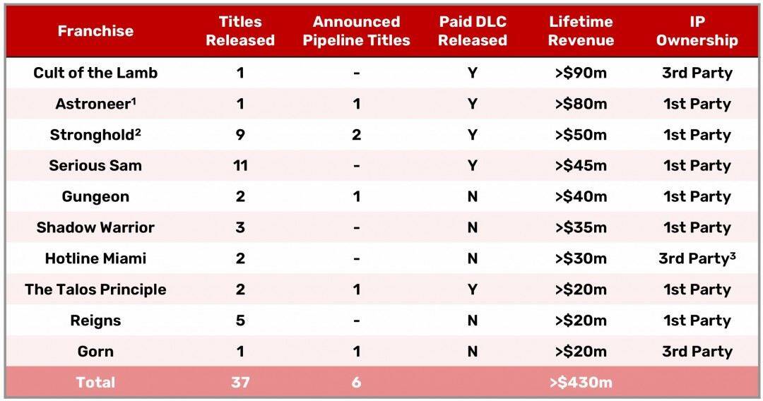 Devolver指出:“相比新IP,玩家更愿意在知名IP上投入时间”,因此计划“通过多种方式深度开发自有热门IP”作为应对策略。目前榜单上已有五个系列确认将推出续作,包括《异星探险家》《挺进地牢2》《塔洛斯的法则2》《戈恩》以及《要塞》系列(年内将推出《要塞:十字军东征终极版》和使用虚幻5引擎开发的新作)。