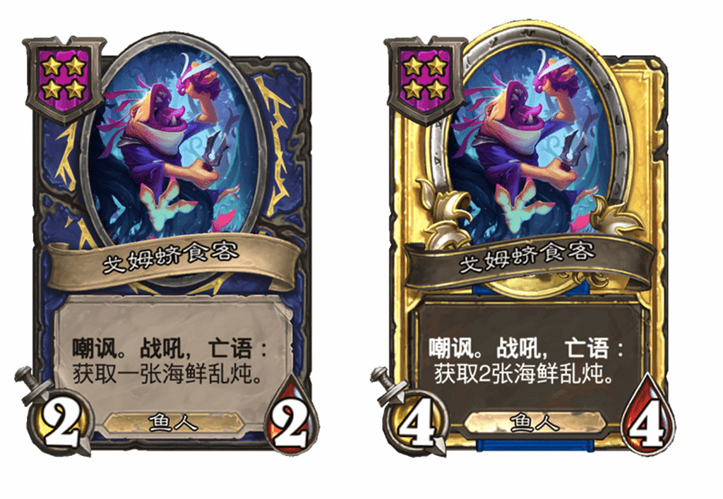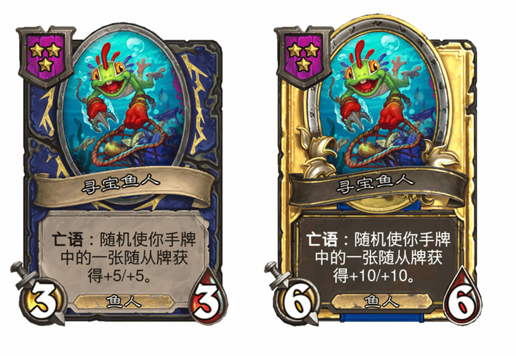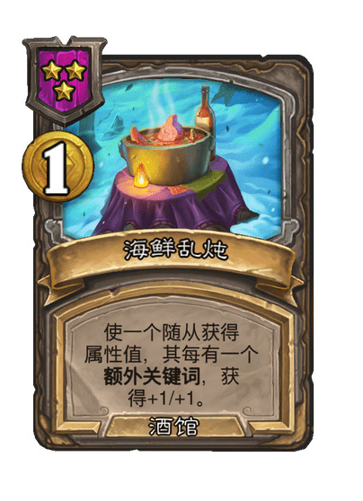 - [3星3/3鱼人] 战吼:在本局对战中 ,你的能使随从获得属性值的酒馆法术额外获得+1生命值。