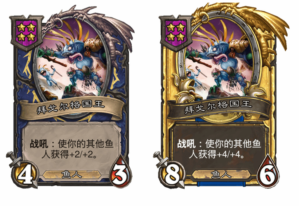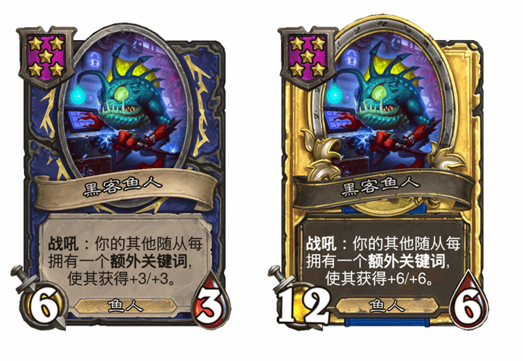 - 旧:[6星3/3] 战吼:你每控制一个鱼人,使一个友方鱼人获得+3/+3。