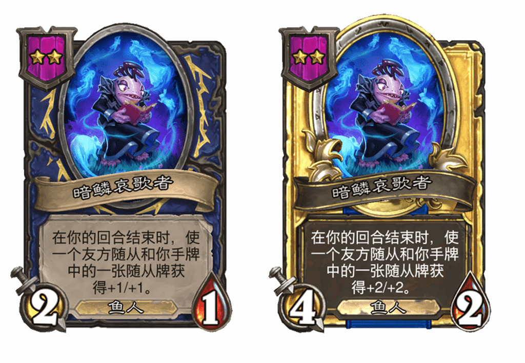 - [2星2/1鱼人] 在你的回合结束时,使一个友方随从和你手牌中的一张随从牌获得+1/+1。