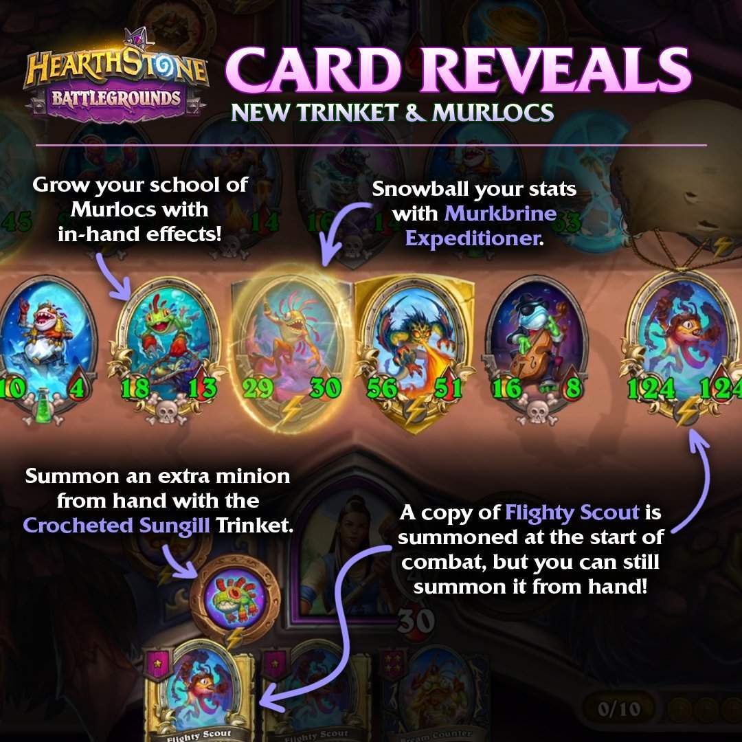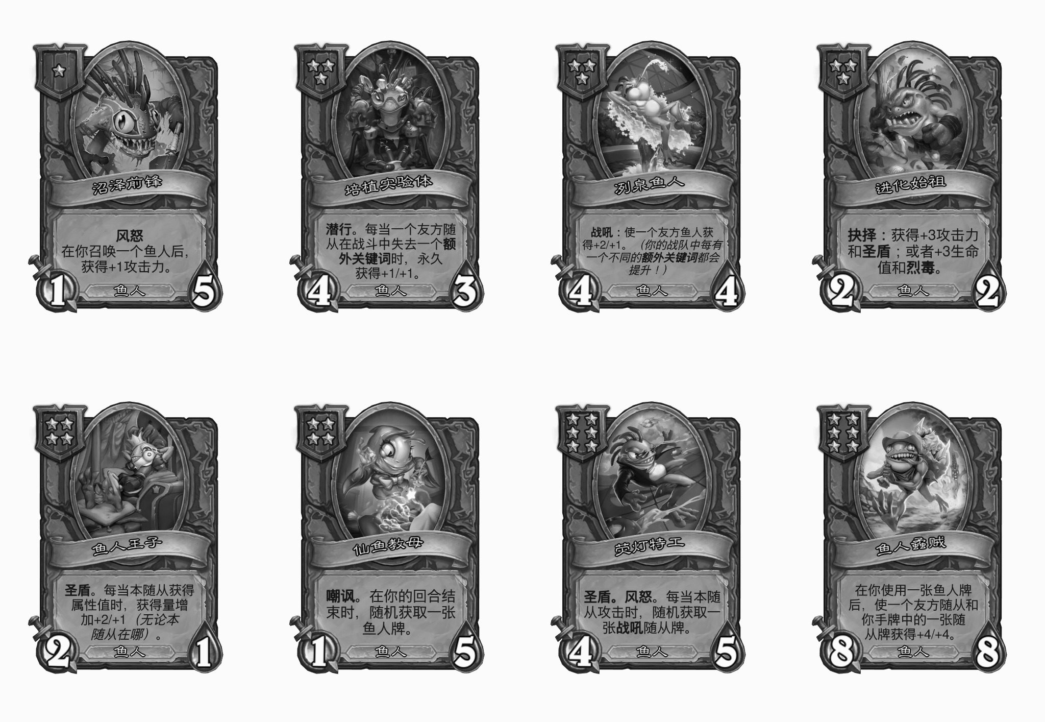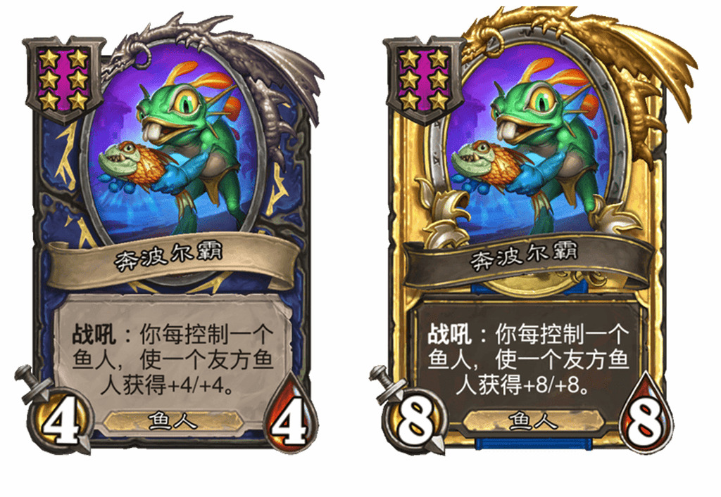 - [4星4/4鱼人] 战吼:使一个鱼人获得+4/+4和一个随机额外关键词。