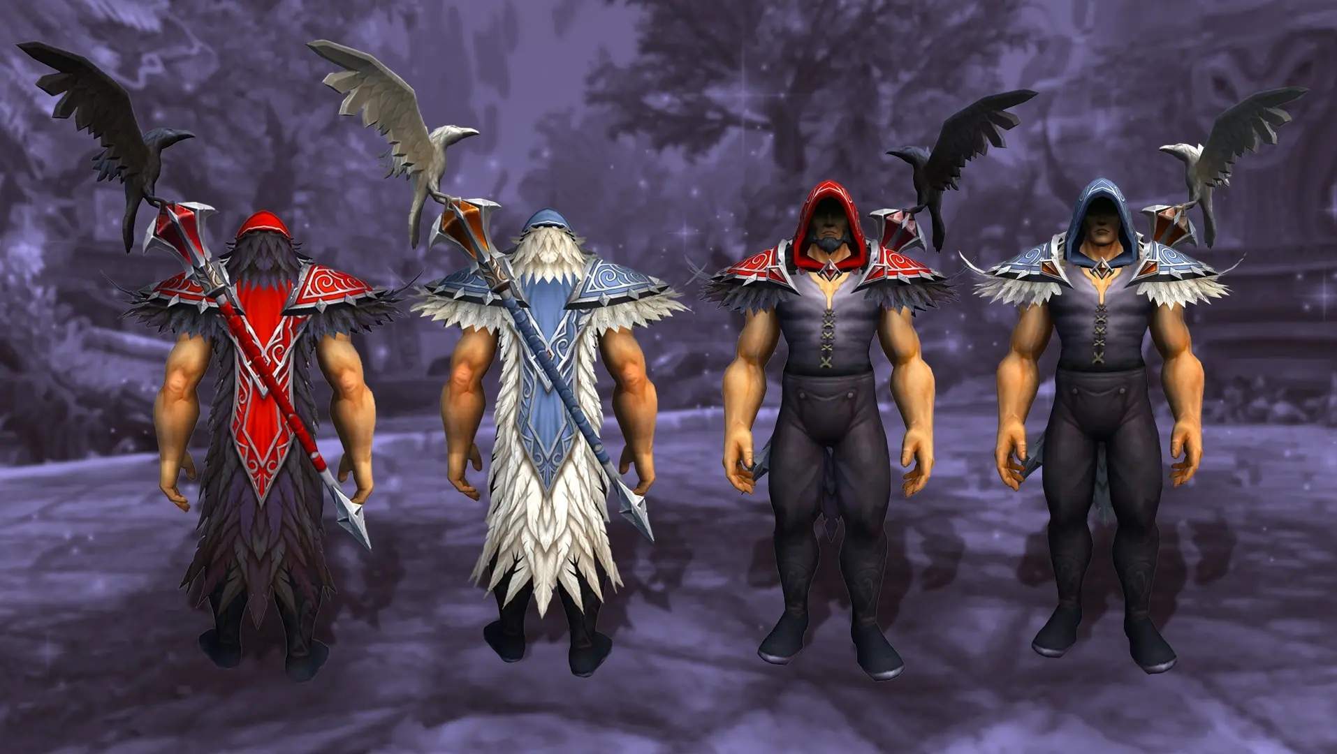 骑上雄壮的巨鸦,披上以麦迪文和卡德加为原型的羽饰法衣,为自己插上智慧的翅膀*。你将获得羽饰大法师和羽饰先知幻化套装,包括法杖武器幻化**(以下职业无法使用法杖武器幻化:死亡骑士、恶魔猎手、圣骑士和潜行者角色。),以及两只巨鸦坐骑。