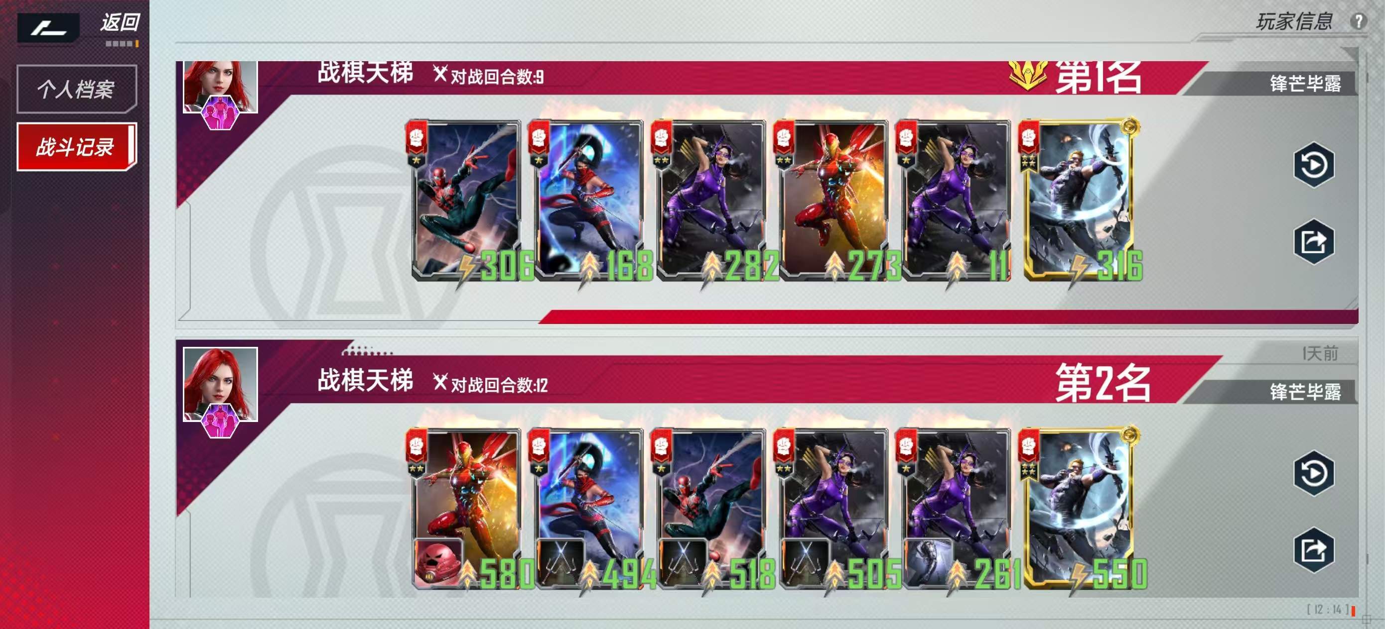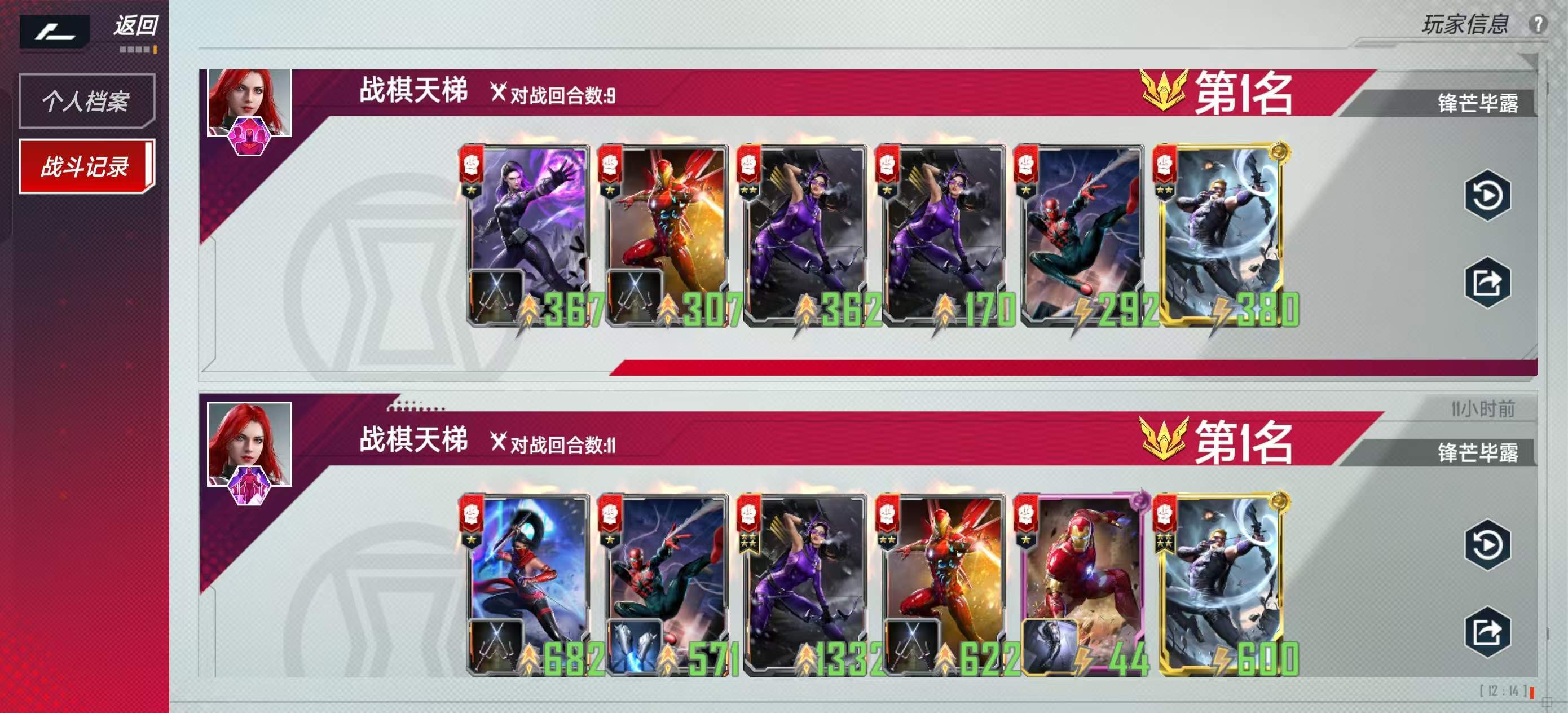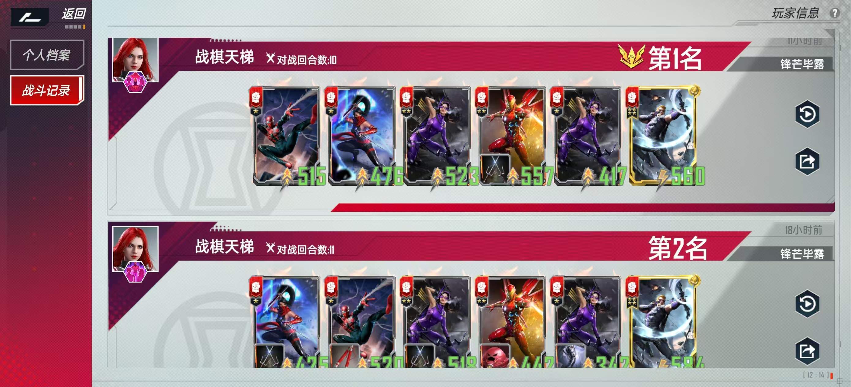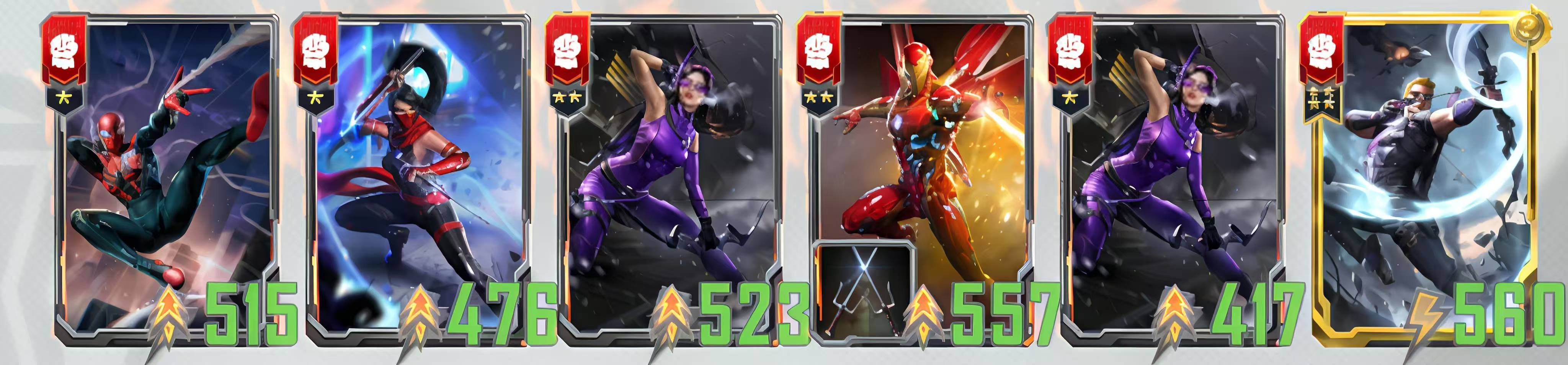 6到9回合:重复上面操作凑齐2+1女鹰眼,鹰眼,新艾丽卡和其他的精准+暴击角色,万能最好。绝境配合万能后续拿暴击,前期不拿,如果万能在场,铁霸王比绝境先来可以买,如果万能已经有暴击,把铁霸王首发给的暴击给马格纳斯蜘蛛侠,蜘蛛侠来得晚让鹰眼拿(6费的鹰眼)。