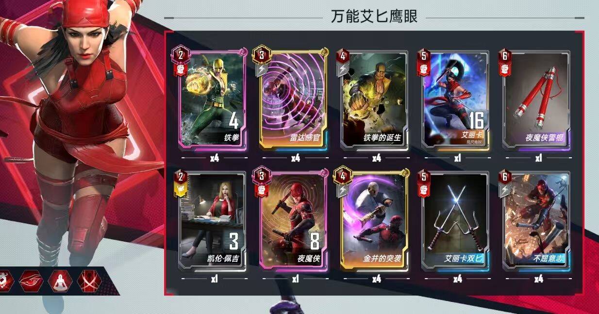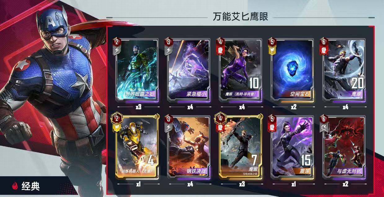 提前说明:这套卡只需要鹰眼链接即可,想玩这套卡最少需要2+1女鹰眼,1张消退鹰眼,1张万能配合隐匿装甲,2张艾丽卡匕首和2张其他精准且暴击角色(首推新艾丽卡和马格纳斯蜘蛛侠)没有蜘蛛侠的话带一张消退鹰眼就可以了。