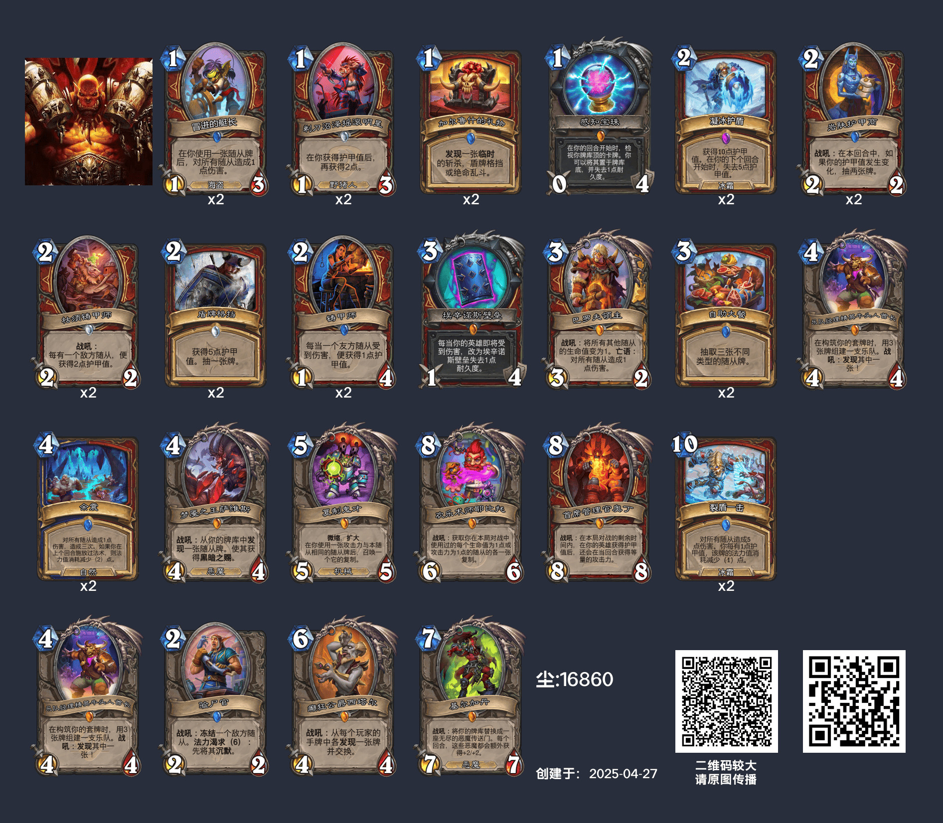 对任务瞎37开:原本这个更劣势,等不到集齐一套大叠甲就被对面滑了,但随后我调整了打法,正确打法是组件直接卖裸上,像打otk一样散叠,少过牌多出牌,礼物不到费用充足的时候不用,被滑后抽上来当乱斗用很关键,一般到最后时刻能有四五十甲,硬抗或者找准机会换掉对面的阿兰娜或软掉武器从而拿下。