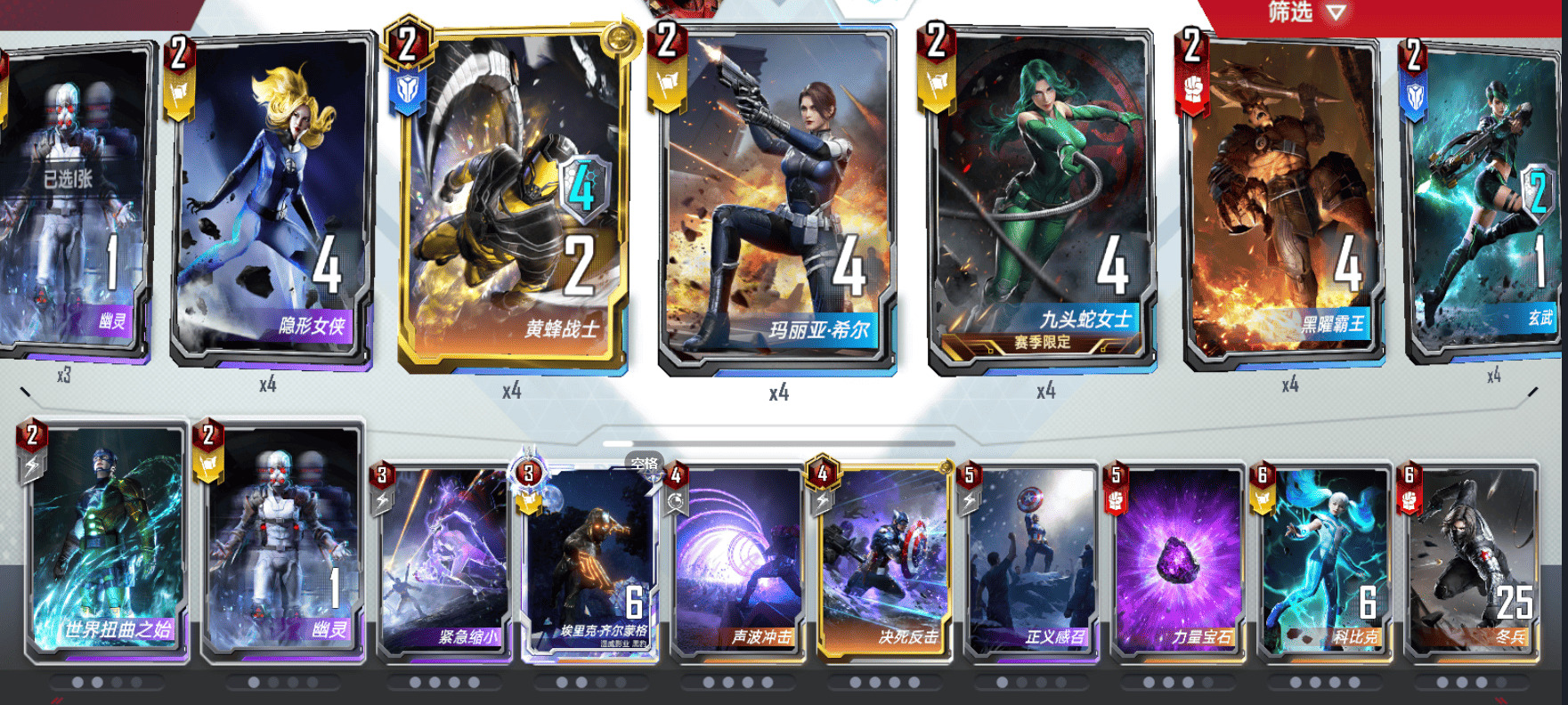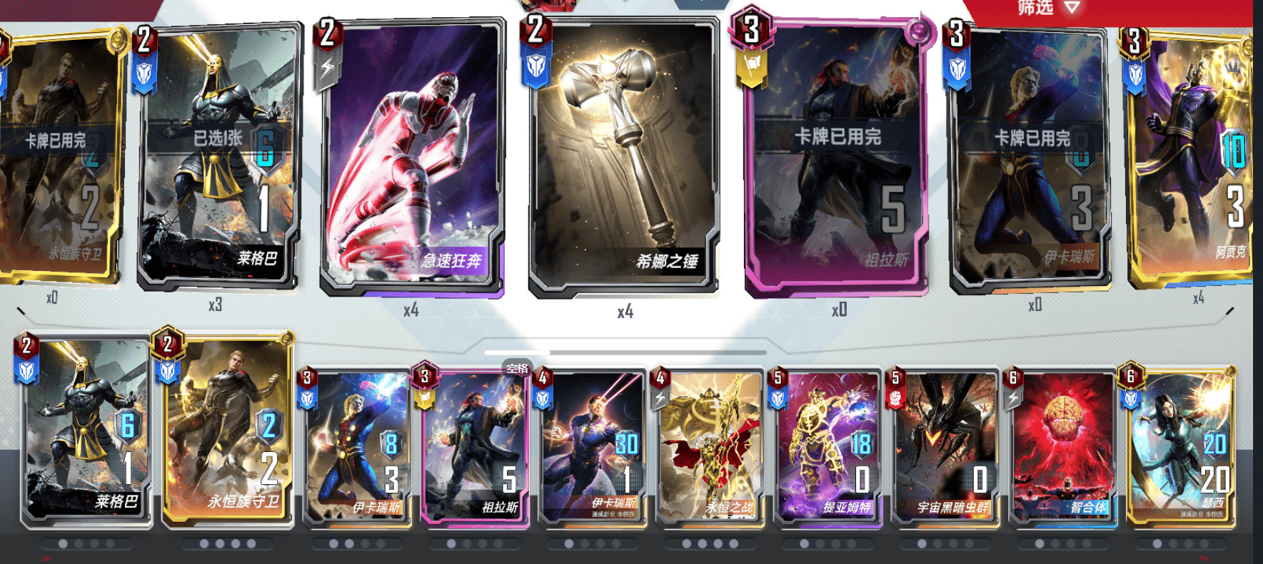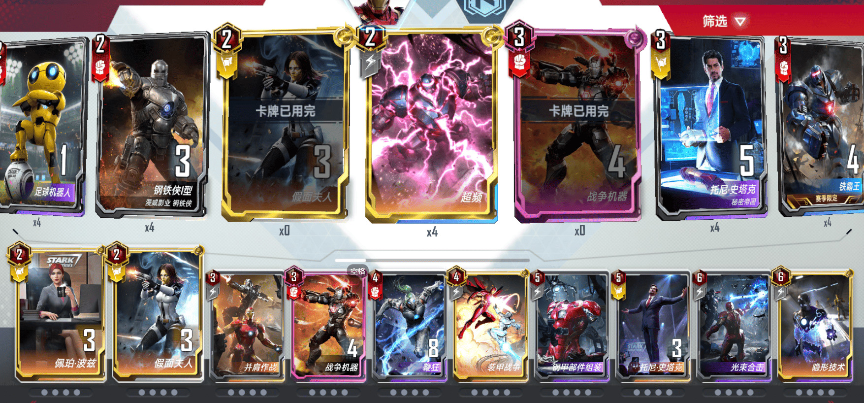 3费:并肩拉满,后期打出把绿浩克、奥创、三费武器、五费武器换成免费滤掉的斯塔克角色;机器拉满,前期稳血神卡
