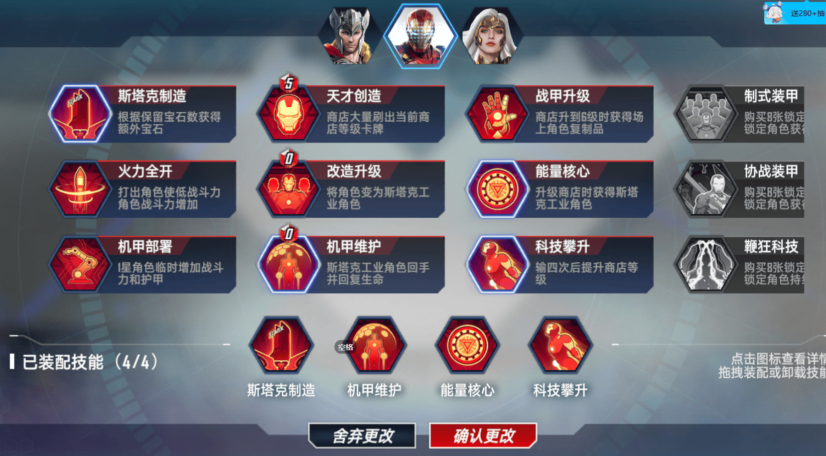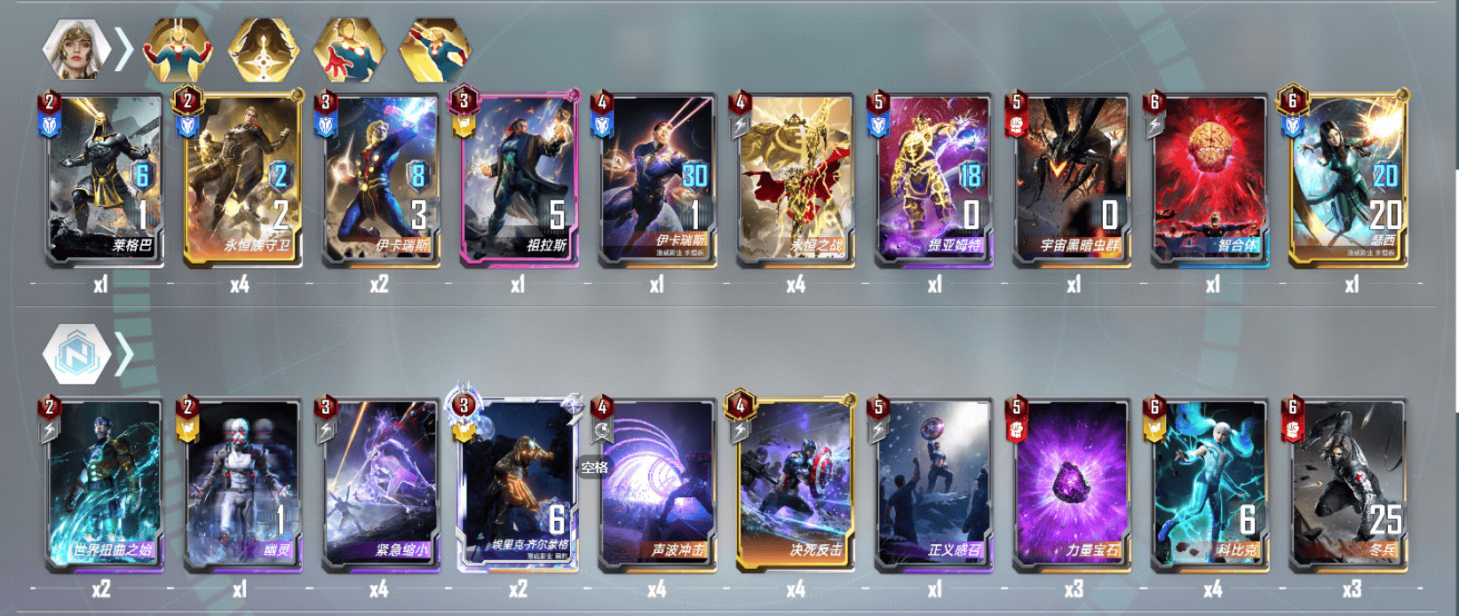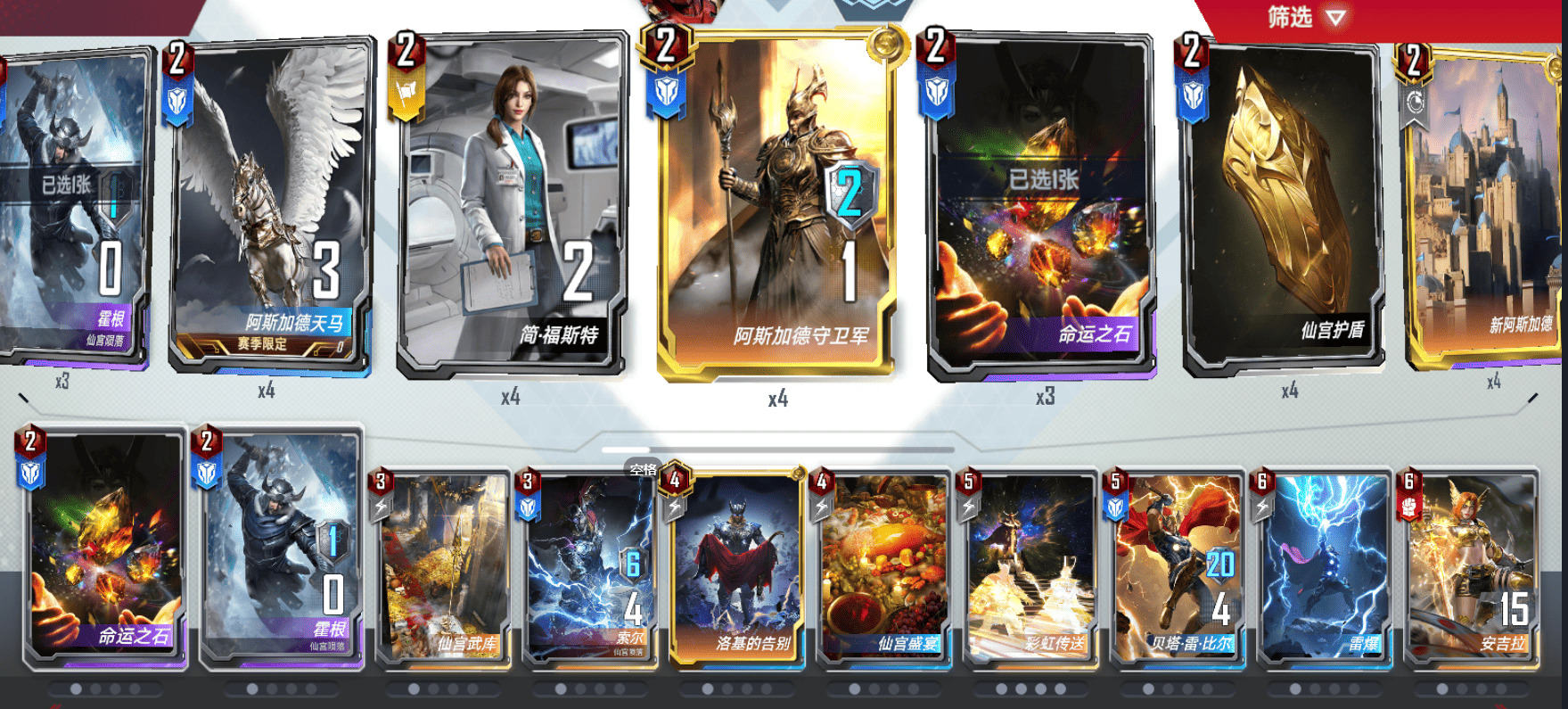3费:并肩拉满,后期打出把绿浩克、奥创、三费武器、五费武器换成免费滤掉的斯塔克角色;机器拉满,前期稳血神卡