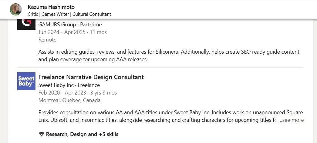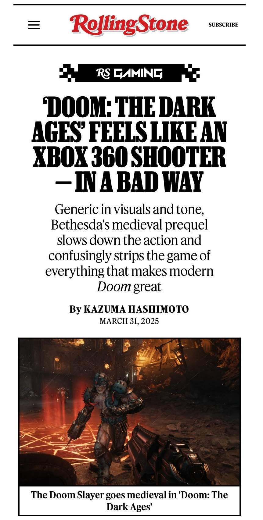 曾和Sweet Baby合作担任“叙事设计顾问”的Kazuma Hashimoto上手试玩了《毁灭战士:黑暗时代》,今年3月底,他在《滚石》杂志上刊文批评《毁灭战士:黑暗时代》不像是一个现代游戏,标题为:《毁灭战士:黑暗时代》感觉像是一个Xbox 360时代的射击游戏,而且是以一种不好的方式。
