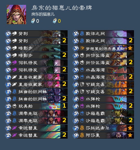 5月初全程海盗贼67%胜率上传,对贼8局全胜,天敌跳水猪瞎也只碰到两局,倒是被快攻DK和星舰DK压制了几局。另外打圣骑士也稍有难受,经常二费准时吃抗性光环,可考虑满编异教低阶牧师与其对冲。