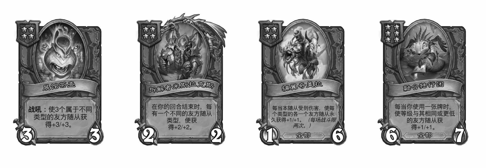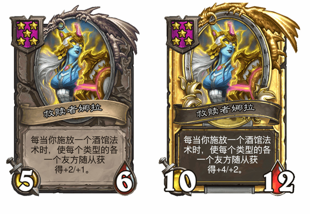 - 新:[5星5/6] 每当你施放一个酒馆法术时,使每个类型的各一个友方随从获得+2/+1。