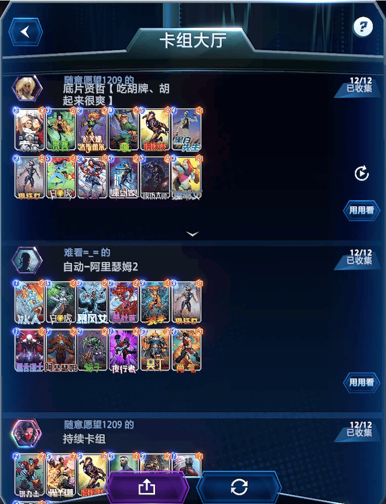 2.卡组大厅 我们精心打造了一个卡组大厅功能,为各位探员提供了一个交流与探索的平台。在这里,希望探员们能够尽情展示自己的实力与创意,将自己得意的卡组,连同精彩的对局录像一并上传至卡组大厅。通过分享,不仅能展现自己独特的卡组构建思路和变体,还能与其他玩家相互切磋交流,共同提升游戏水平。 当你浏览大厅时,如果发现了契合自己游戏风格或当前环境的流行、强力卡组,只需轻松点击 “用用看” 按钮,系统便会瞬间自动帮你完成该卡组的组建,让你即刻便能在实战中体验新卡组的魅力,无需再手动繁琐地一张张添加卡牌。