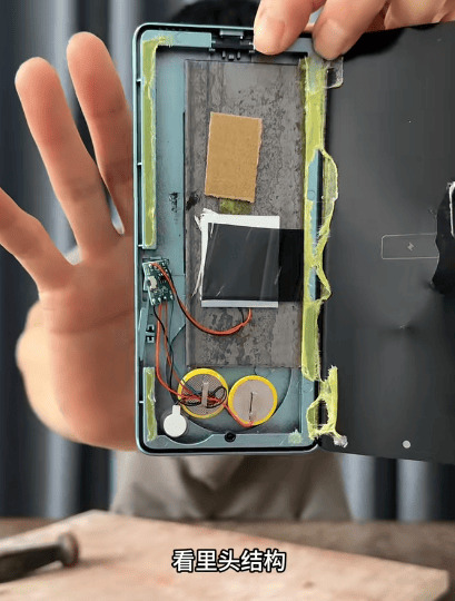这还不是重点,这种手机根本开不了机,一直提示电量过低。拆开后大吃一惊,竟然只有一个灯泡和两块纽扣电池,还有铁片增加配重。