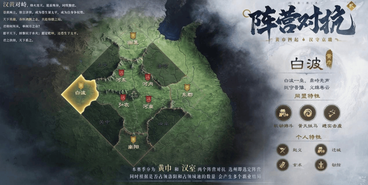 “非对称对抗”是《三国:谋定天下》本赛季的最大亮点。这个赛季以历史上著名的黄巾起义为蓝本,通过首创的非对称对抗剧本形式,让众多玩家能够加入黄巾或者汉室阵营,亲身参与到这场改变历史进程的大战之中。众所周知,资源匮乏、仓促起义的黄巾军与坐拥正统、资源充沛的东汉朝廷是有极大的实力差距,正如历史上黄巾军依靠民众支持与灵活战术对抗官军,三谋的非对称对抗便是还原了这种真实的历史,玩家在游戏中亦需根据阵营特性制定截然不同的发展路线——或如张角般“多点奇袭”,或如皇甫嵩般“稳扎稳打”。