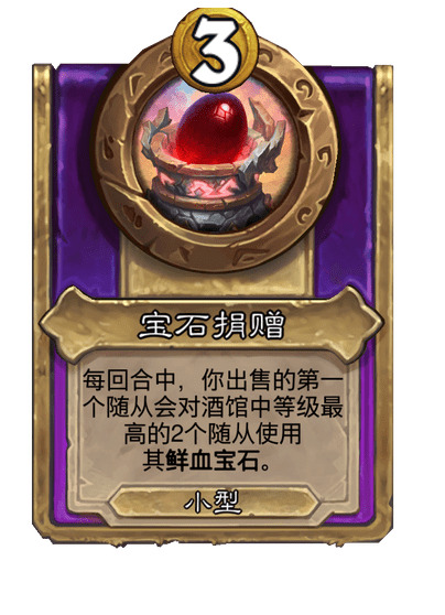 - [小型3费] 每回合中,你出售的第一个随从会对酒馆中等级最高的2个随从使用其鲜血宝石。