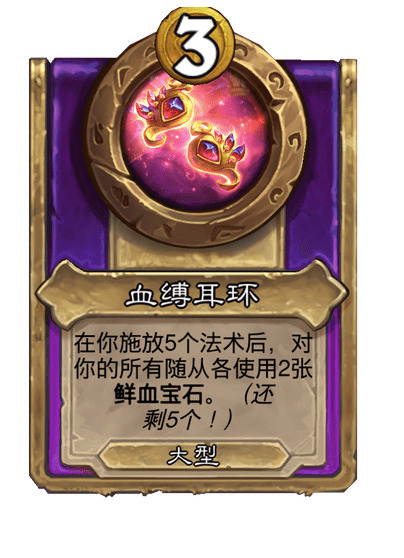 - [大型3费] 在你施放5个法术后,对你的所有随从各使用2张鲜血宝石。
