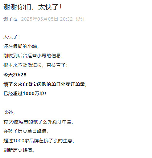 这种组合拳带来的效果也是相当明显的,就在五一假期的最后一天,饿了么官方宣布,来自淘宝闪购的单日外卖订单量已经超过1000万单。