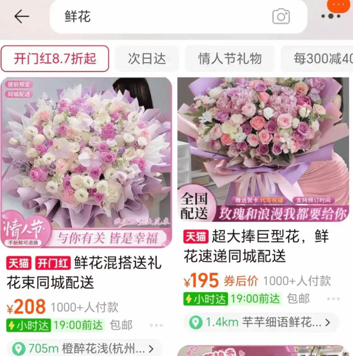 2月14日情人节当天,鲜花订单暴涨了20多倍;