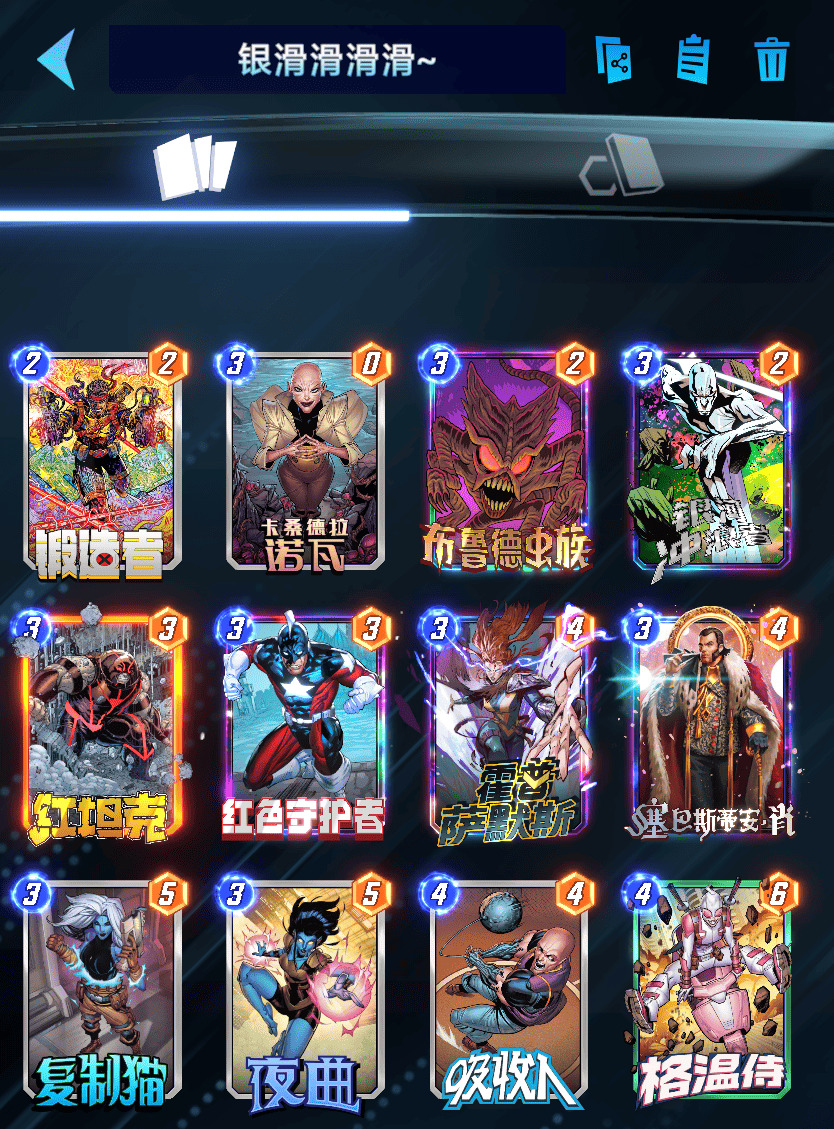 假设对手第二回合打出了那张被偷取战力的卡,是一张金刚狼,金刚狼的身材就会因为银貂的效果变成2/0。