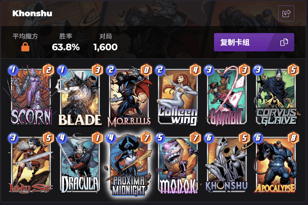至于国际服的传统弃牌卡组,目前分为疤眼弃牌和孔苏弃牌两种流派,其中孔苏体系会选择携带暗夜比邻星: