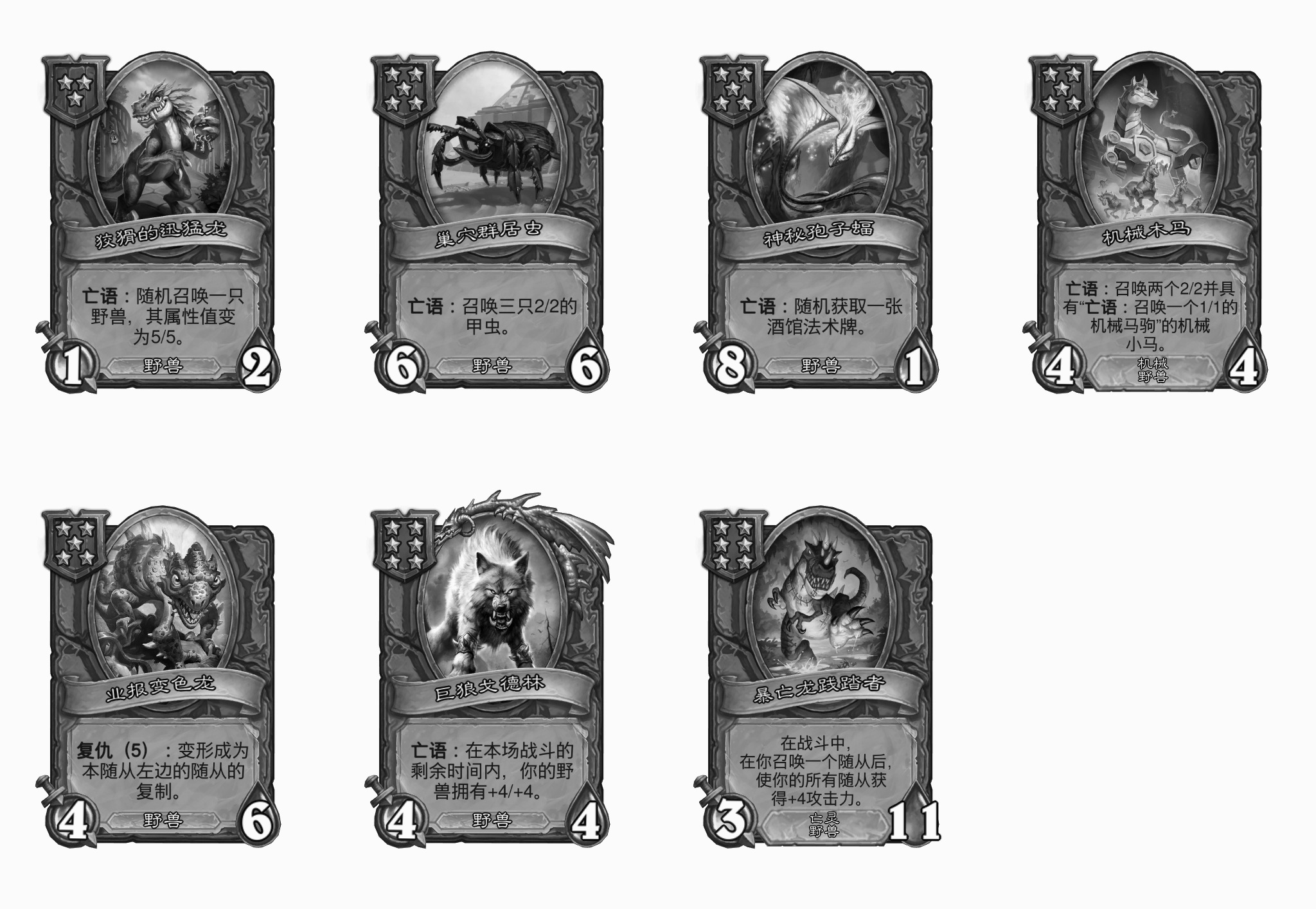 - [2星3/3野兽] 当你在战斗中有空位时,召唤一只3/1的野兽并使其立即攻击。