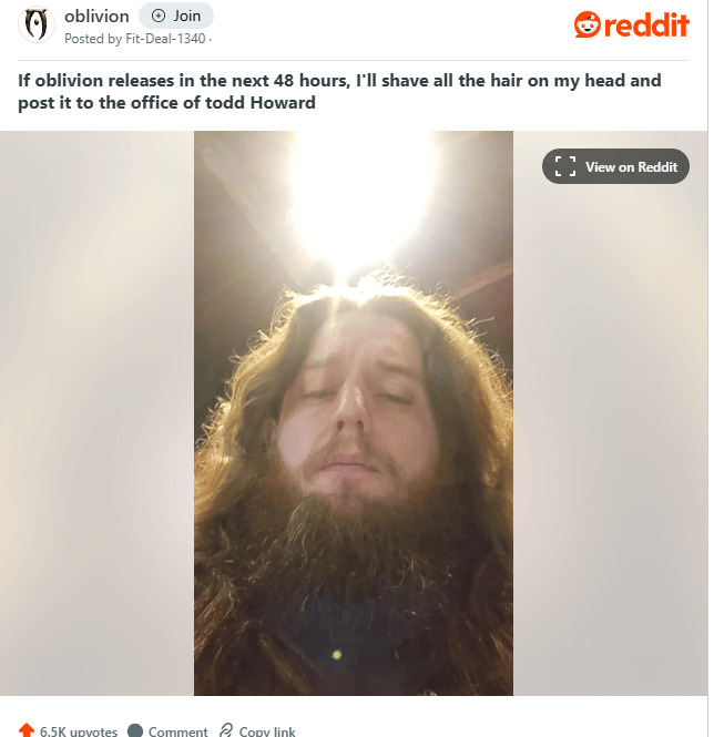 ·在4月20日的晚上,Fit-Deal-1340玩家在论坛上赌咒,称如果《上古卷轴4:重制版》玩家赌咒48小时内发售就剃光自己的头发全部寄给陶德。