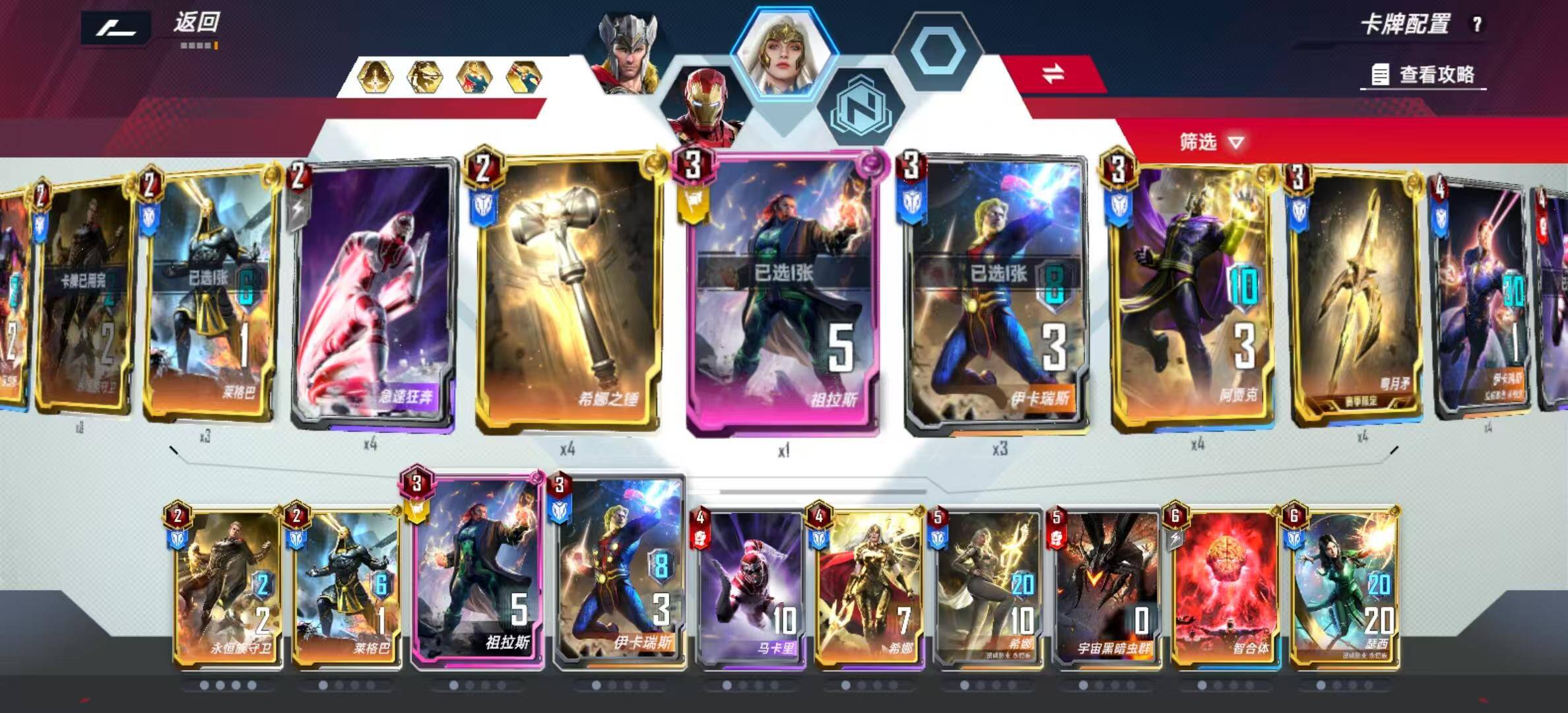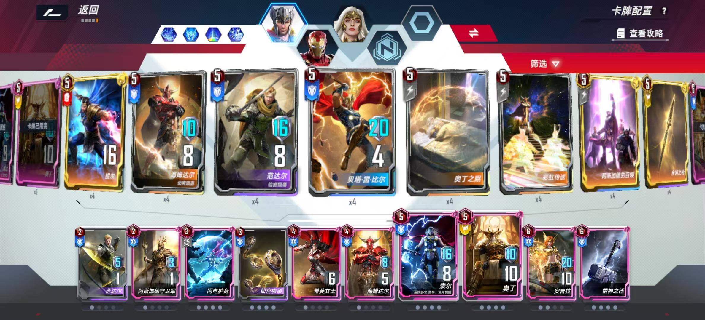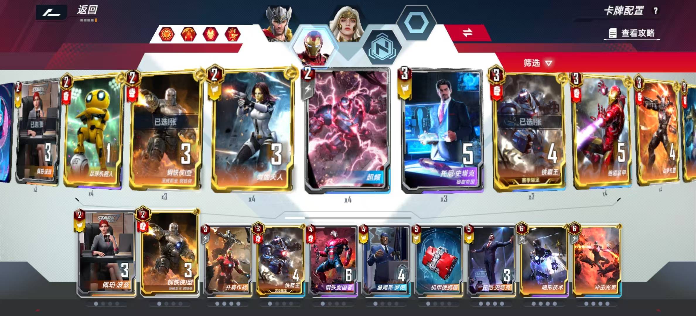 实际上,【雷霆构筑】我这里有6个角色备选,钢铁侠,黑寡妇,希娜,蜘蛛侠,海拉,惊奇。