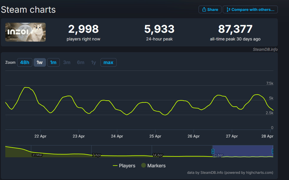 Krafton旗下生活模拟游戏《Inzoi》自今年初以近9万同时在线人数创下Steam抢先体验纪录后,遭遇玩家持续流失。截至4月28日,该作日均在线人数已跌至6000左右,尽管数据仍属同类作品上游,但较峰值缩水超94%。现在,游戏总监金亨俊(Hyungjun Kim)发布开发者来信,分享我们的未来沟通计划。