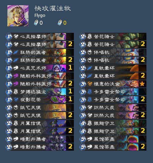 这是一套站场快攻,起手留低费随从全力站场,站住场以后减少不必要的交换尽量走脸,资源缺乏时通过灌注补战场随从和直伤,通常是让对面来不及解场或者返场而胜利。如果被拖到10费回合以后就比较难了。优势是这种形态的牧师比较少,对面不容易防;