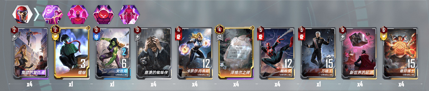 【万磁王】:卡组核心之一 让场上的卡被蜘蛛侠减费后不会消退