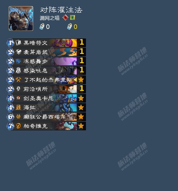 灌注法,有30的灌注法和40的灌注法,40灌注法似乎是为了抗快攻而选择多10滴血,不过这样他抽到灌注和野火的概率会低一些,比起30会更卡手。不过不论打30还是40,我们最核心的单卡就是麦芽糖浆,可以处理他3波的小精灵帮助我们前期占据主动权,因为他灌注的随从也都是中规中矩的身材,我们随从和法术的质量都比他高一些,加上他过牌需要吃小精灵2费和野火3费,我们过牌是扣子和馆长这样的不亏节奏的卡,所以我们前期大概率是能站住场面的。