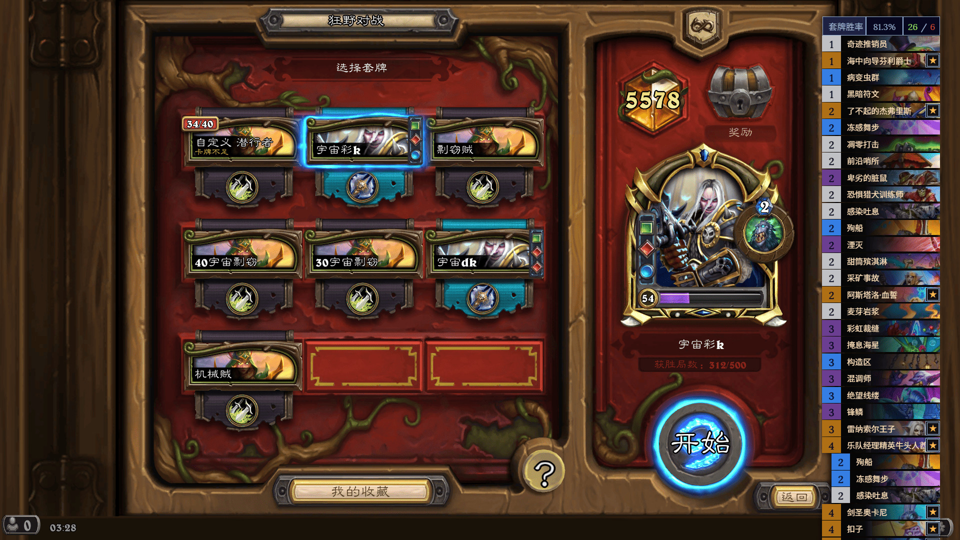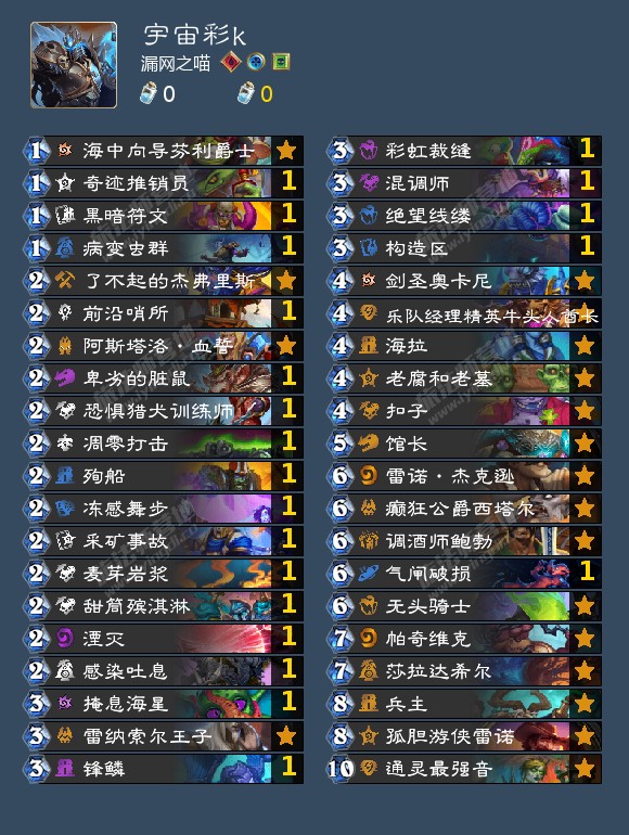 30宇宙贼,这是一套我也比较喜欢玩的卡组,不过我觉得dk打宇宙是优势,因为我们前期节奏比他凶一些,能站住场,罗哥3血也比较容易被我们处理,哨所、锋鳞、剑圣、冻步、海拉都可以干扰到他。因为他回血不多,场面压力比较大的话容易迫使他姐夫解场,我赢的对局基本上都是节奏推过去了。
