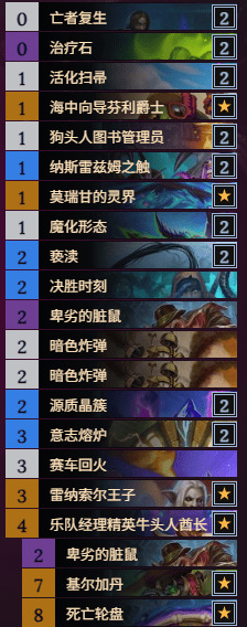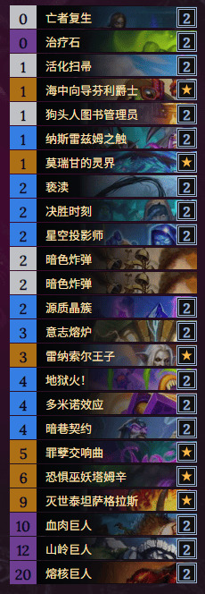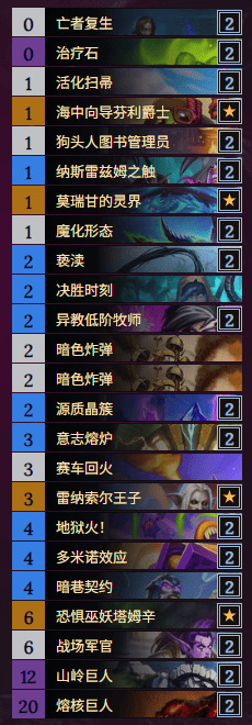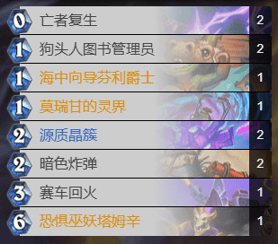 最后卡组里还有两张活动卡位,我为了延缓生气气、号角骑等卡组的展开势头,带了两张异教低阶牧师,大多是前期自己不顺的时候,用来卡号角骑4费拉怪和生气气0费buff圣契,环境少量的任务瞎也可以非常好的针对。环境比较好的段,可以换一些后期质量卡(带个牛啥的)。