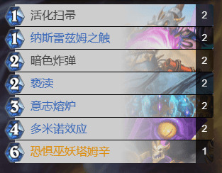 暗色炸弹加强后对抗快攻非常好使,前期可以解肥婆等众多1/3的随从,还有概率抽亵渎。没有亵渎也是1卡换1卡,不会减少手牌。