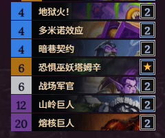 卡组的节奏基本是1费狗头人,2费抽(或晶簇),3费抽一口(后手可以拍熔炉),4费白石头\地狱火+红石头\暗巷契约,5费再拍巨人(或者先手熔炉+抽一口),6费决胜时刻复活8/8恶魔+一个石头。目前就实战体验,因为卡组过排能力强,所以从4费起节奏无论怎样都不会太差,要算好手牌,爆牌是对巨人术的侮辱口牙!(对抗快攻解场就完事,绝对不要贪展开)