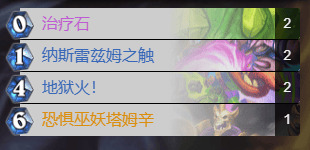 治疗石,因为有很多自残卡,很大程度上可以弥补血量。在有些时候(6-10费),可以先用自残组件痛揍自己然后地狱火回到15血,然后再打治疗石,可以在过牌检索的同时让自己回到一个非常安全的血线。