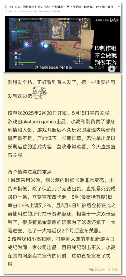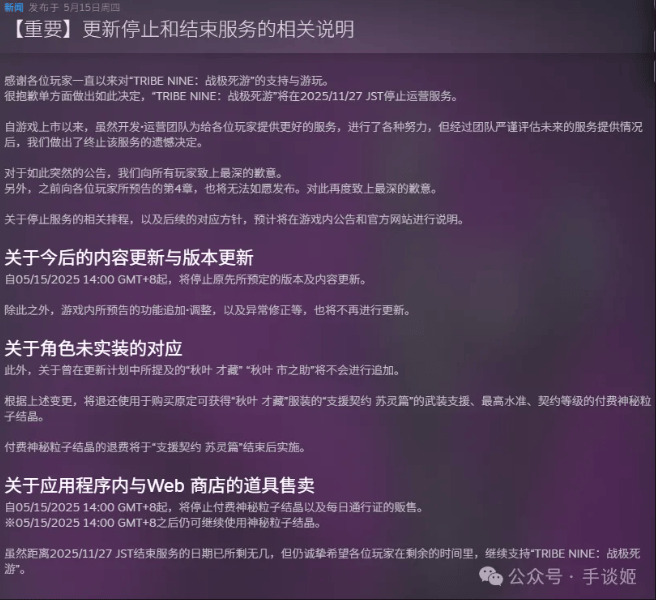 最近手谈姬老提到小高和刚是因为他在疯狂用古法宣传自己的新作《百日战纪》。然而由他担任原案,由Tokyoo Games和Akatsuki Games合作推出的新IP《TRIBE NINE》的游戏《TRIBE NINE:战极死游》却宣布停服。