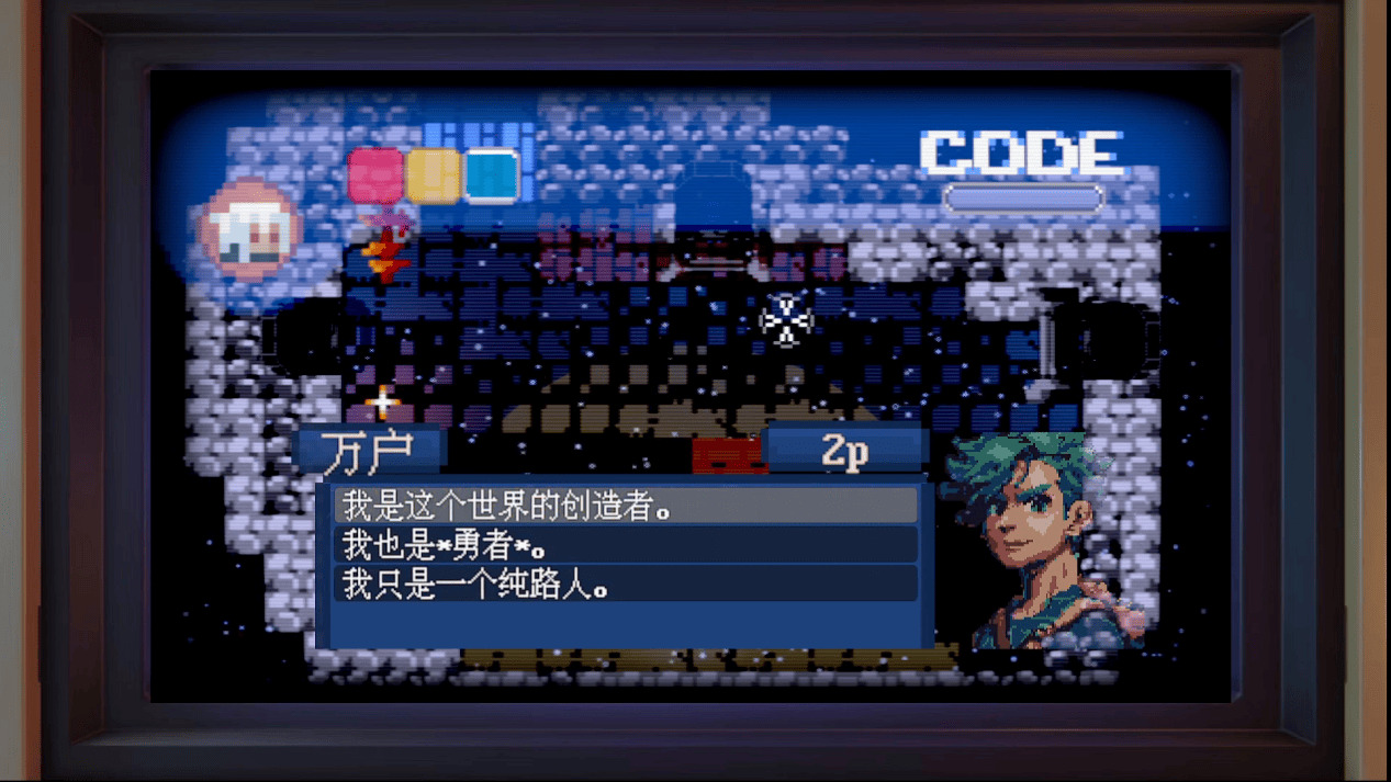 身为游戏世界的“造物主”,主人公拥有一套不同寻常的战斗方式。他能够运用“编程”能力发射代码来触发关卡内的机关、创造杀机,以及运用“美术”能力来重新绘制地图、改变地貌,亦或是运用“音乐”能力来控制敌我双方角色的情绪和思想。