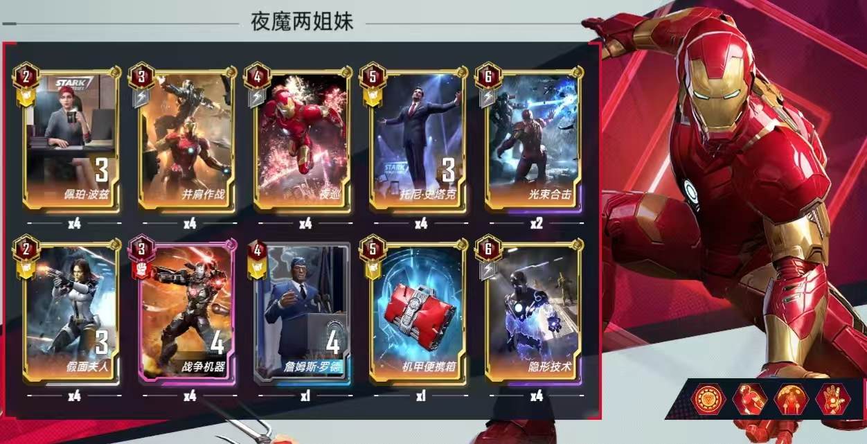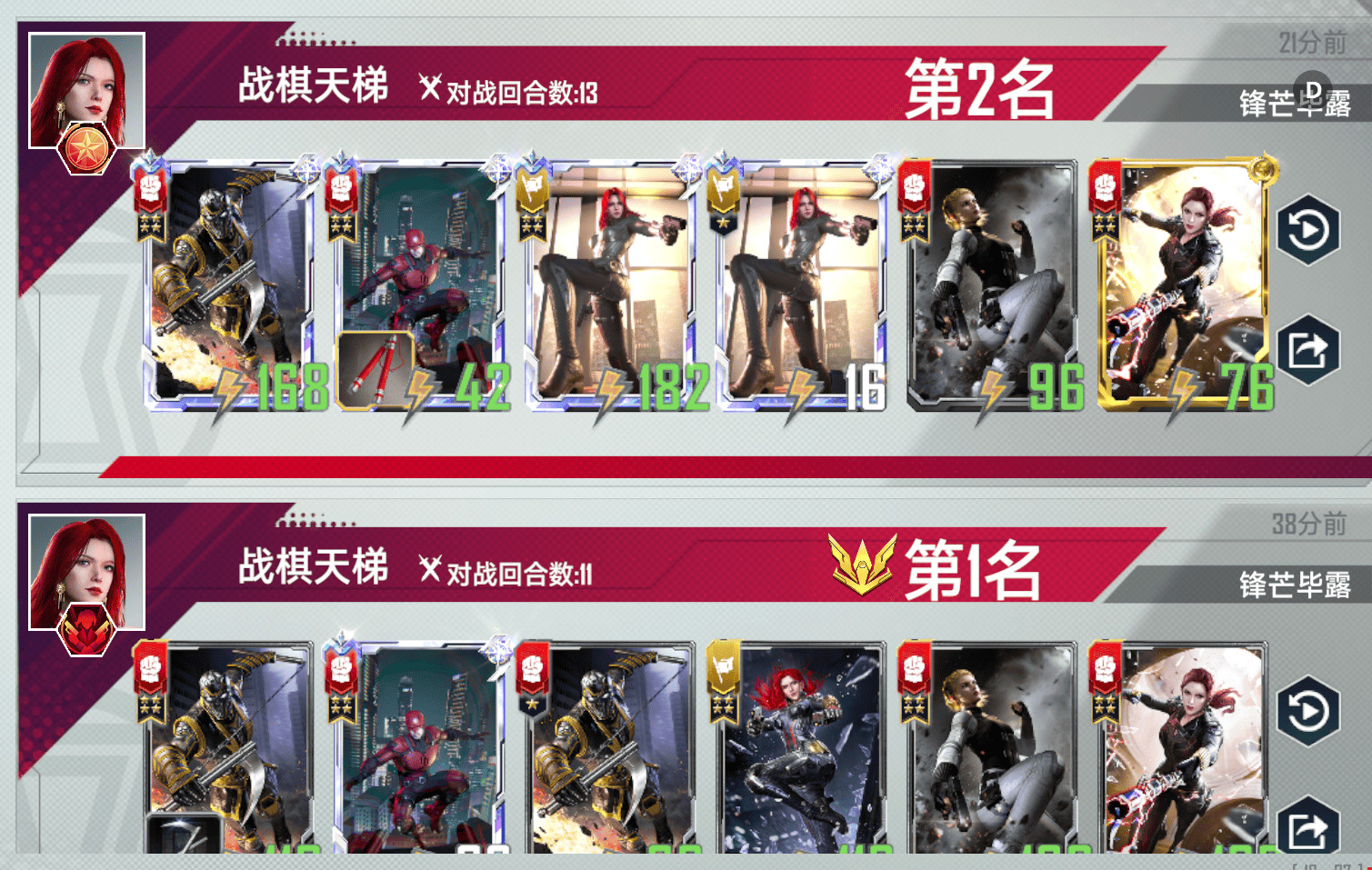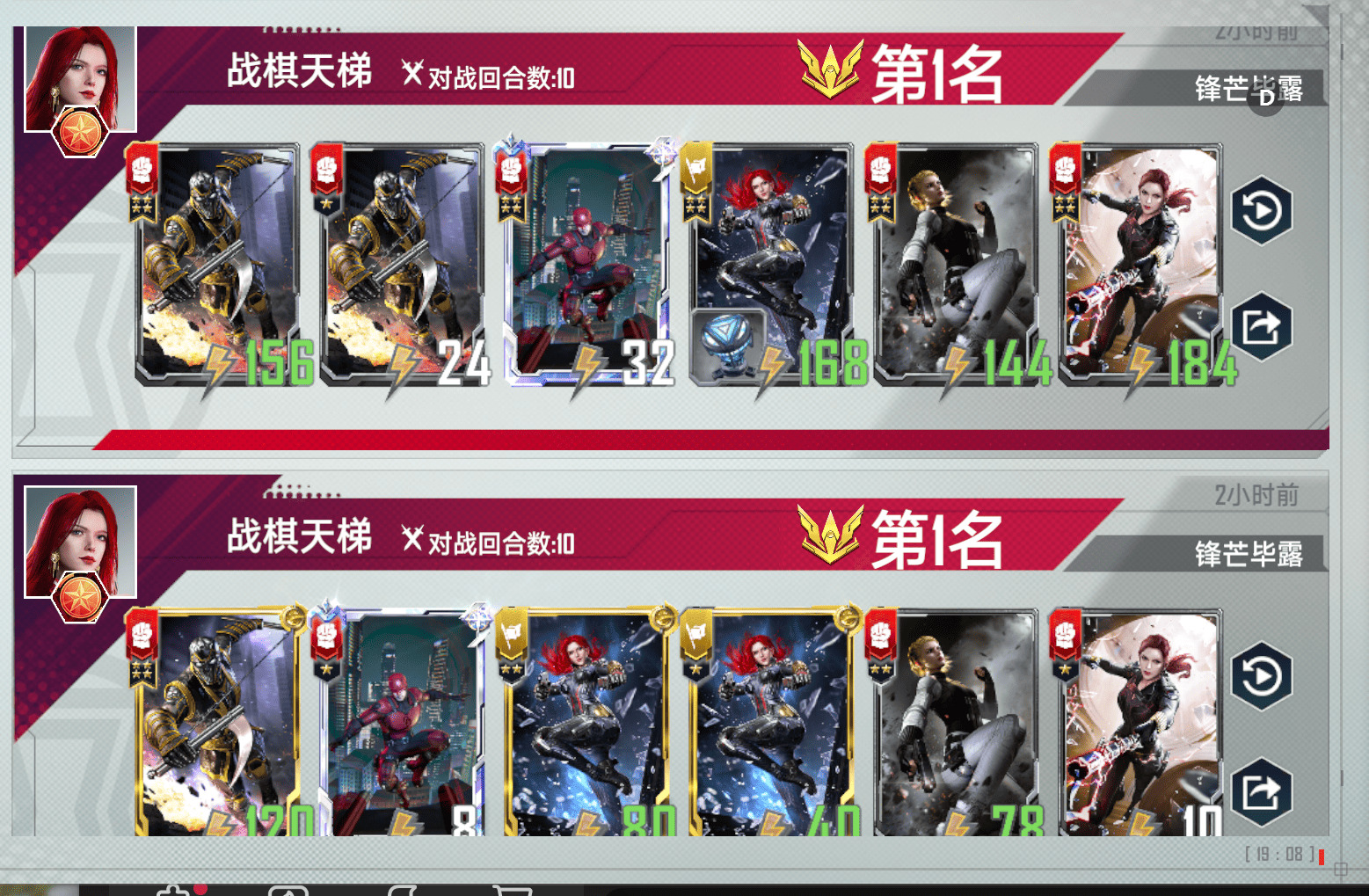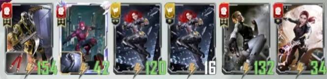 4费的黑寡妇要放最后一个位置,因为她行动过后会让左侧的隐匿红卡行动,然后5费叶莲娜放黑寡妇左边,这样左侧的浪人行动过后4费的黑寡妇又会行动,形成永动,且对面托尼给你暴击武器的时候可以给夜魔侠使用。