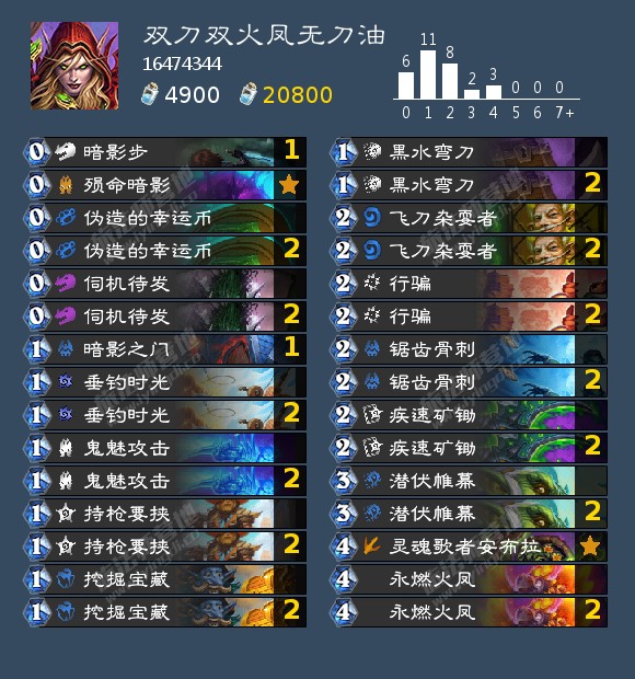 关于启动:思路就是快速检索安布拉+飞刀+双火凤,配合暗影步和硬币攒费,尽可能早的打出4+2+任意两张牌(理想情况是两张0)+循环火凤,完成40血的斩杀。