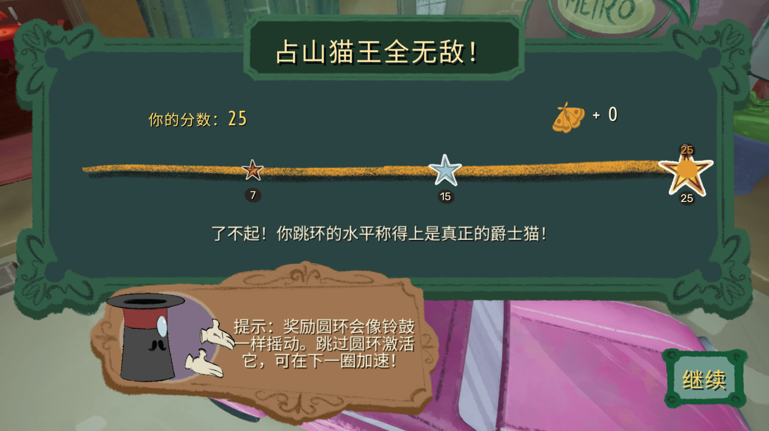 当然了,这里的跑动模式也有些缺点,如:其中一个环状赛道内,玩家是以侧视角看着猫咪奔跑的,也就意味着,按D前进,按WS左右调整,这样的情况下,侧视看不清猫咪的左右位置,不小心被地形卡脚或者错过加速圆环也是很有可能发生的,而且确实很影响游戏体验。(下图为该跳环关卡笔者艰苦尝试十余遍最终拿下三星)