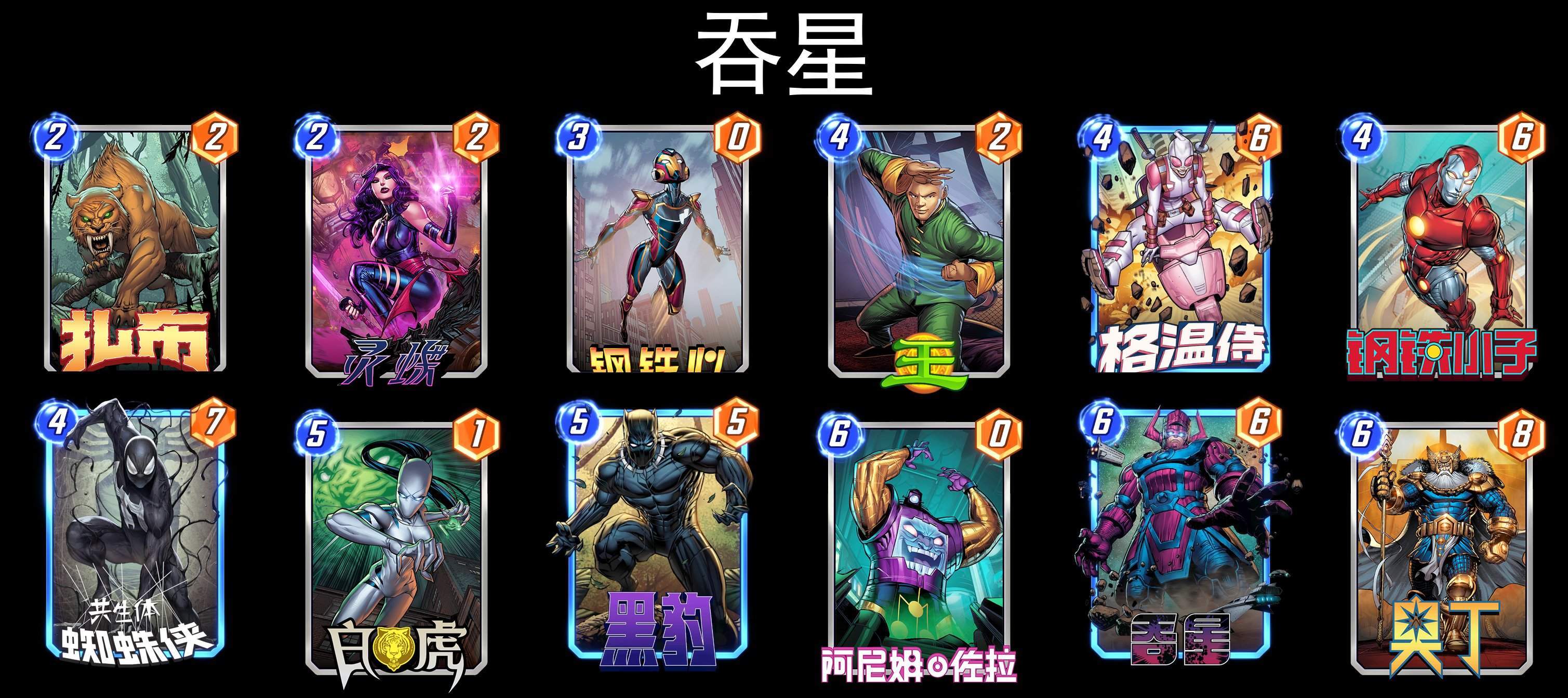 场上只要拍下共生体蜘蛛侠,对手就一定要防备你最后一回合吞星的操作,必须这个区域大于13战力,可以利用这一点,其他路吞星,或者顺势展开黑豹,白虎,电视机等连招。而且很多时候对手很容易漏算被地形和格温侍加过攻击的吞星。