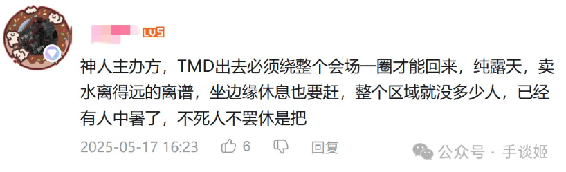 不光是水方面离谱,因为是室外,官方也没怎么准备一些遮阴的地方,很多人基本处于一个完全暴露在太阳下被暴晒的状态,而且休息区也少之又少。