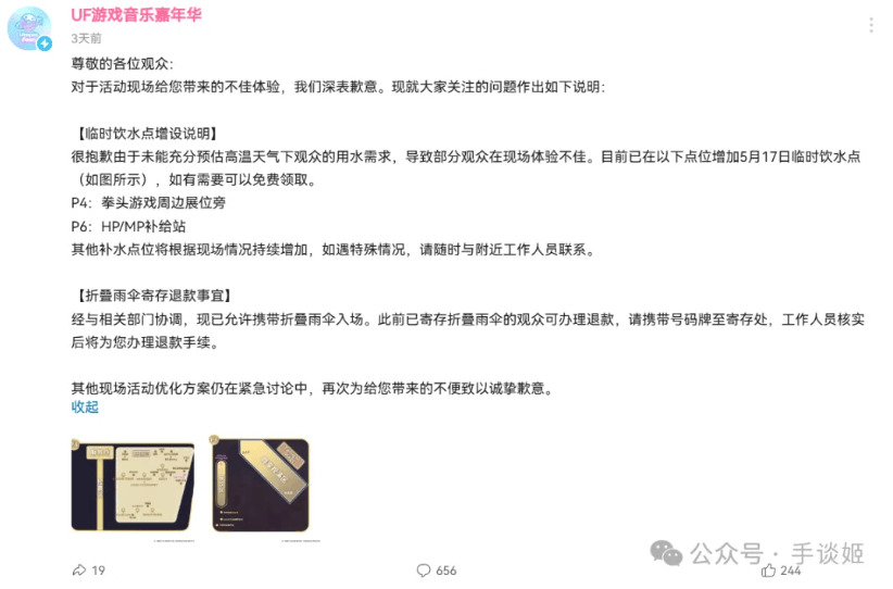官方看势头不对马上道歉,并表示第二天可以带伞和地垫,还增加了几处卖水的摊位,大家终于能喝到不会售罄的免费水了。
