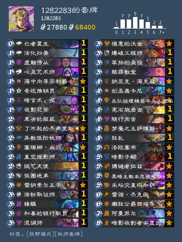 宇暗的环境竟然出奇的好,整个过程中遇到很多40号角骑,我们是优势,对阵快暗和大哥萨也是我们的优势。尽管面对圣契骑大劣,好在数量不算很多(打骑士输的6把有3把是圣契骑)。 带了几个搞人小工具:1. 324爆破工程师:回合结束埋的炸弹可以打乱对面的排序,在面对元气骑和号角骑时都有奇效,324站场的身材不算很亏,还可以偷鸡法师的冰箱(没成功过)。2. 笨拙的杂役:除了面对快攻用处不大,在面对各种骑士、任务瞎时都能让对面很不舒服,虽然也会影响到自己,但功大于过。 牛里面是:子嗣、神雷诺、亡者复生。 欢迎大家讨论!